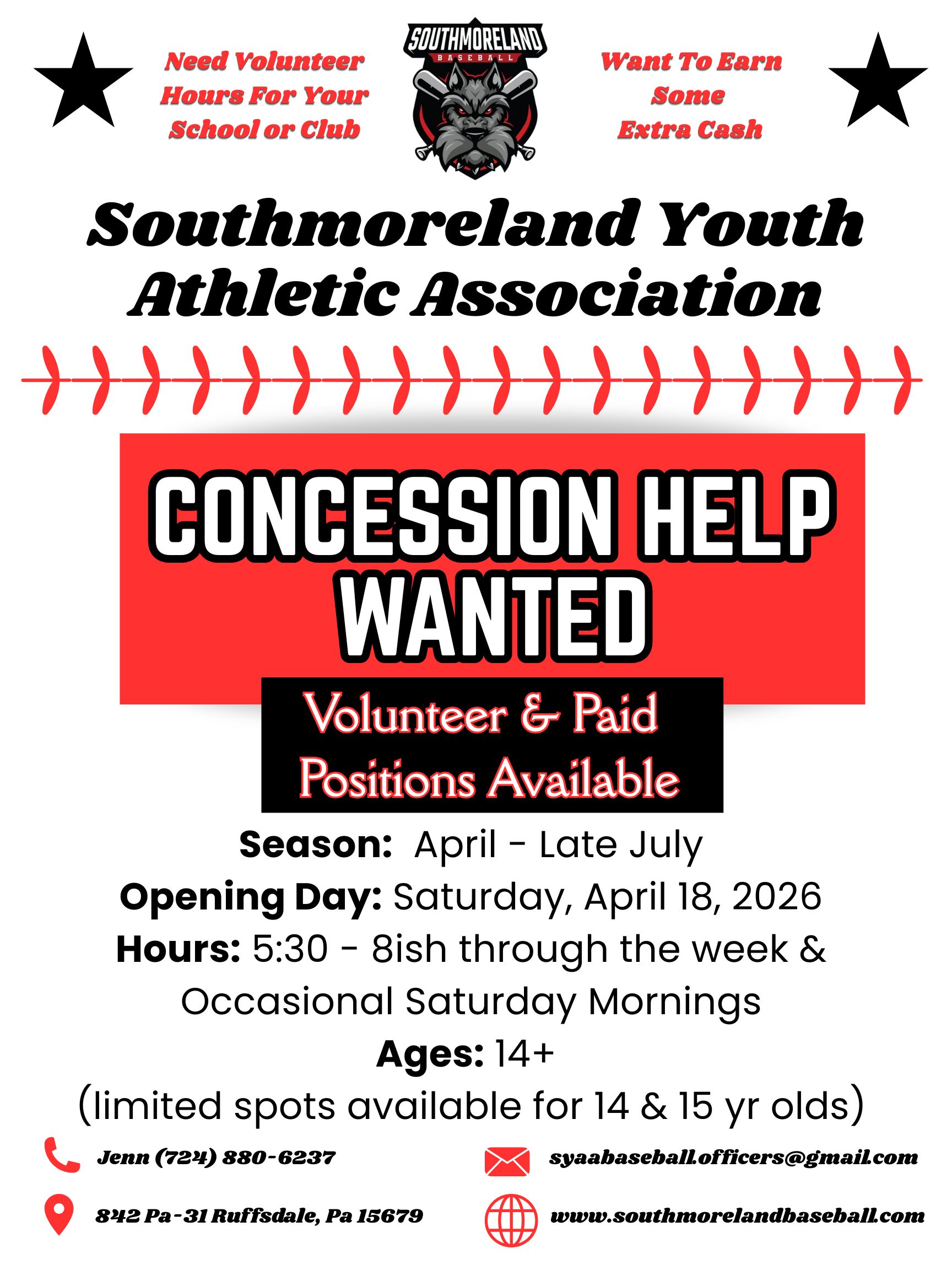 Southmoreland Youth Athletic Association is looking for reliable and friendly individuals to help run our concession stand during the upcoming season! We would like to have a few consistent people. Shifts will be available first come first served. We are currently looking for help on opening day (Saturday, April 18th). Once we receive the schedule for the season a sign-up link will be listed here for those games.